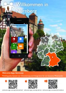 Wir begrüßen als neue aktive Stadt Nürnberg in der Welcome App Germany. Wie zahlreiche andere Landkreise und Städte zuvor, hat ein Sponsor für die Stadt Nürnberg den innovativen Ansatz unserer App sowie den echten Mehrwert für Zuwanderer und Migranten, aber auch Helfer und zuständige Behörden erkannt – woraus die Beauftragung zur Einbindung in die App resultierte. Die Stadt Nürnberg steht nun als eigenständiger Bereich zur Verfügung mit wertvollen Informationen zu den großen Themenfelder „Leben und Alltag in Deutschland“, „Migration und Einwanderung“, „Asyl“, „Notfallsituationen“ und „Alltagsleben“ sowie Inhalte zum Miteinander in Deutschland und sprachliche Unterstützung mittels Deutschphrasen verfügbar – in allen Sprachen Deutsch, Englisch, Französisch, Russisch, Arabisch, Farsi, Griechisch und Türkisch. Für das bessere Miteinander Vorort wurden zu allen Einzelthemen jeweils eine Vielzahl lokaler Ansprechpartner hinterlegt. Zur Unterstützung der Verbreitung haben wir schicke Postkarten und Aushänge zur Verfügung gestellt.